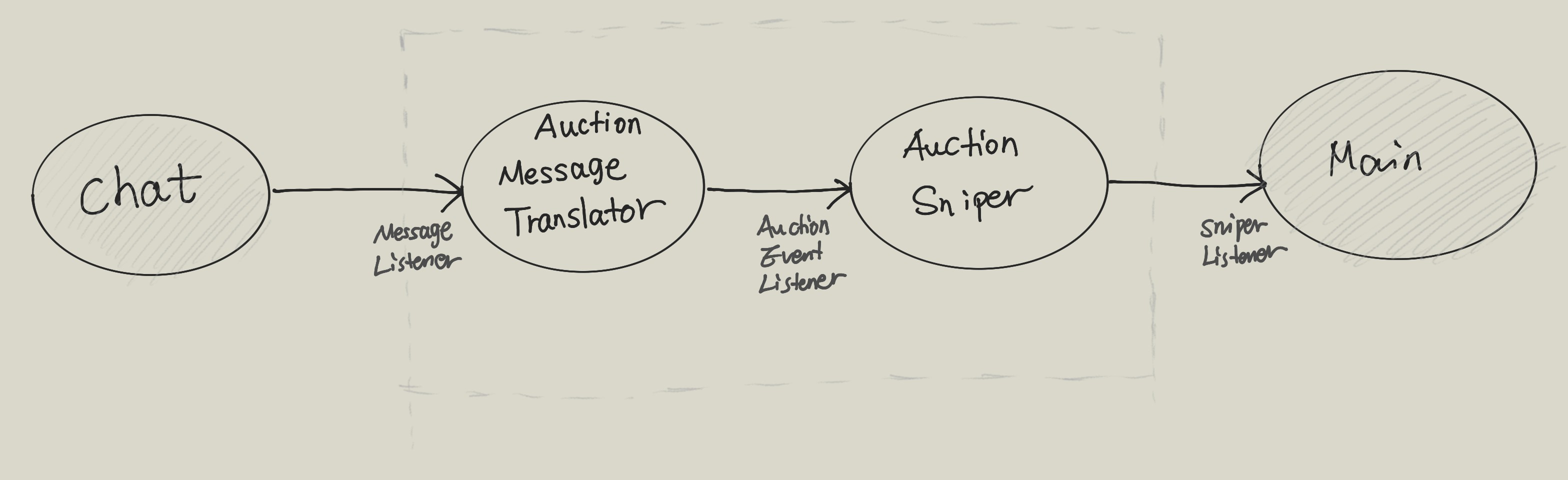 Now it is time to create a AuctionSniper class to make Main’s life easier. Now thinking about it, it is quite weird that there is no class named after sniper since our application is call auction sniper. Let’s also create a SniperListener to put into AuctionSniper, so that AuctionSniper does not directly depend on UI.